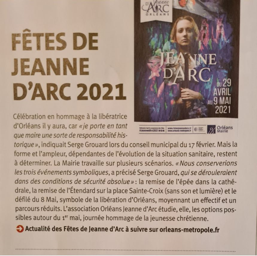 La lecture du numéro d’avril 2021 d’Orléans-Mag nous apprend qu’en fonction des circonstances sanitaires actuelles, l’association Orléans Jeanne d’Arc étudie « les options possibles autour du 1er mai, journée hommage de la jeunesse chrétienne ».